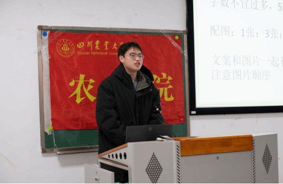 紧接着,农学院学生融媒体中心负责人郭宣均进行了新闻稿写作与投稿技能培训,详细讲解了内宣新闻稿的格式、要素、具体用语等注意事项,同时培训了推文的制作方式及格式要求。